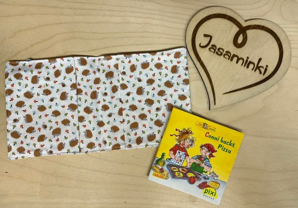 Die Pixihülle ist aus Baumwollstoff und wird mit einem Gummiband verschlossen. Es haben bis zu 14 Pixibüchlein Platz.
