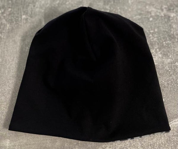 Die Beanie besteht aus 2 Seiten. Eine ist aus einem grauen Tropfen Baumwolljersey und die andere Seite aus einem schwarzen Uni Baumwolljersey.