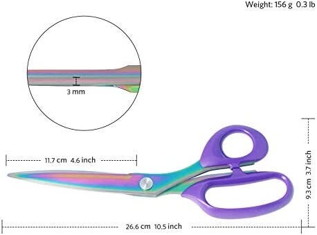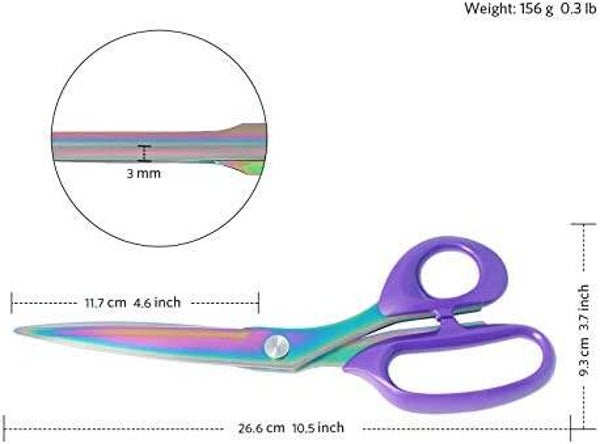 - Die Schneidklingen dieser Stoffschere bestehen aus titanbeschichtetem Edelstahl und der Griff aus hochwertigem ABS. Gesamtlänge: 10 Zoll; Gewicht: 130 g.