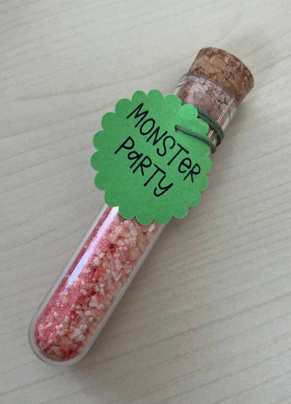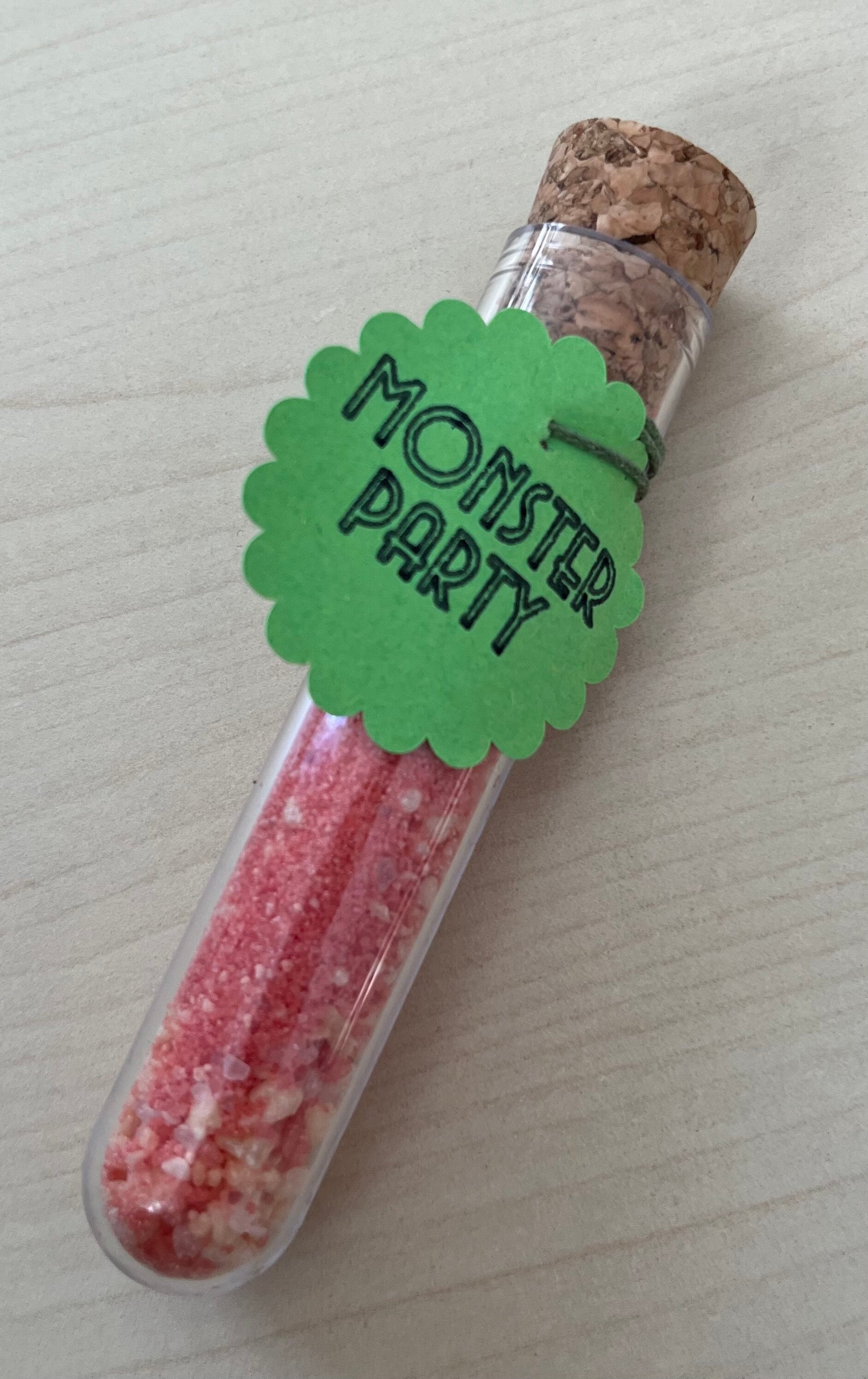 Dieses hübsche Reagenzgläschen ist gefüllt mit Badesalz.